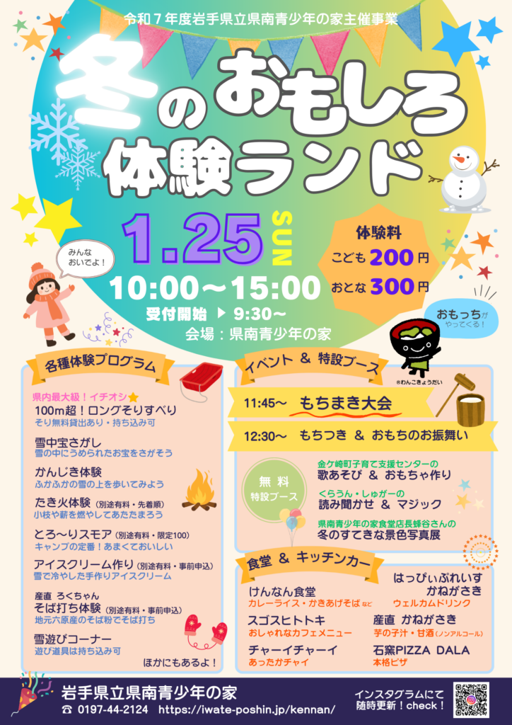 岩手県立県南青少年の家 イベント情報を更新しました。 2025年12月25日 【冬のおもしろ体験ランド】の開催要項・チラシを掲載しました。ぜひご覧ください。 冬のおもしろ体験ランド 対象:どなたでも 開催日:令和8年1月25日(日) 詳細ついては以下のボタンからご覧ください。 冬のおもしろ体験ランド