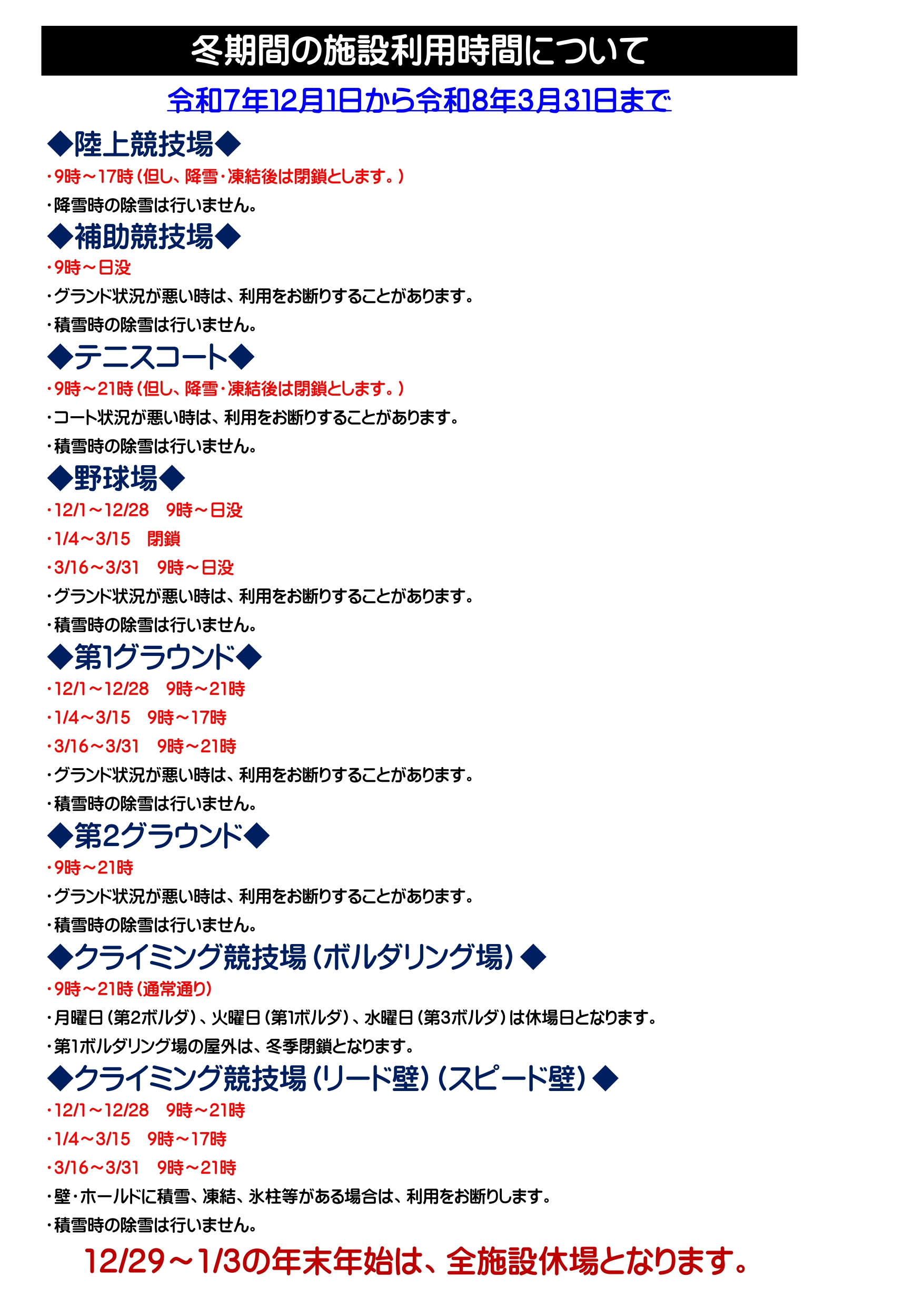 岩手県営運動公園 冬期間の施設利用時間変更について 2025年10月28日 令和7年12月1日から令和8年3月31日までの冬期期間の間、施設の利用時間が変わります。 各施設の利用時間等は、下記にてご確認くださいますようお願いします。 冬期間の施設利用時間について(県営運動公園)