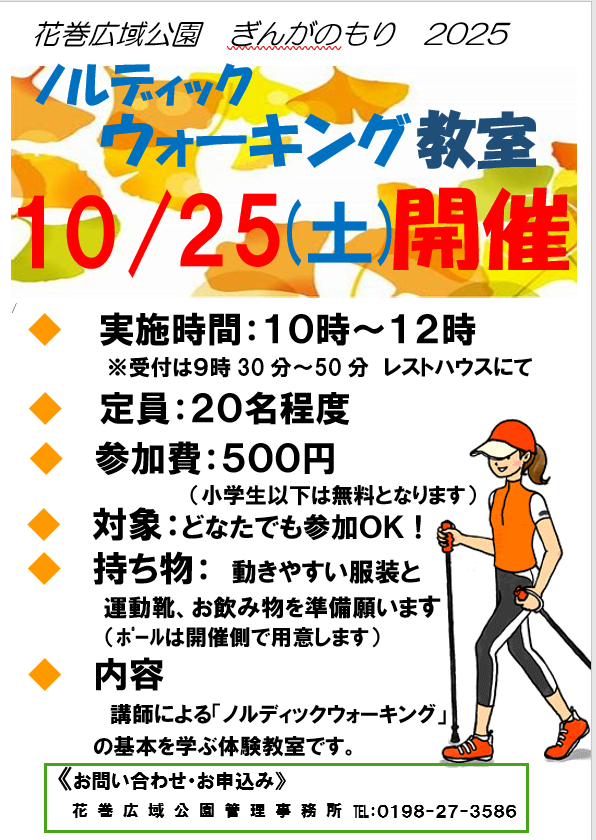 花巻広域公園で10月25日(土)にノルディックウォーキング教室を開催いたします!