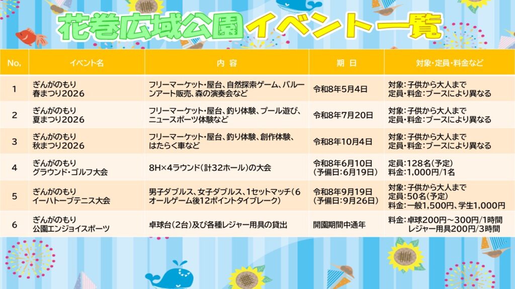 「WADOパークはなまき」では、今年も、春、夏、秋の「ぎんがのもりまつり」、グラウンドグラウンドゴルフ大会、テニス大会など、たくさんのイベントを開催することとしています。